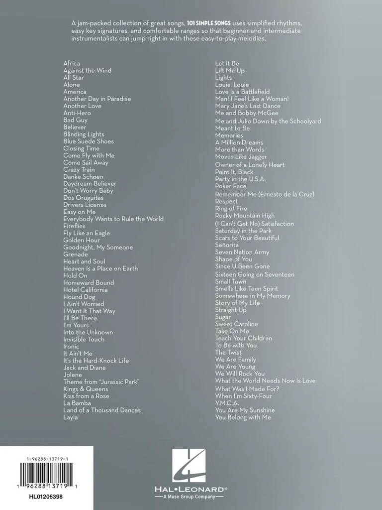 Til je trombonespel naar een hoger niveau met 101 Simple Songs! Deze beginnersvriendelijke collectie bevat eenvoudige ritmes, toegankelijke toonsoorten en melodieën die je graag zult spelen. Nummers zijn onder andere: Africa · Anti-Hero · Drivers License · Fly Like an Eagle · Hotel California · Invisible Touch · Jolene · Owner of a Lonely Heart · Rocky Mountain High · Shape of You · Take On Me · We Will Rock You · When I'm Sixty-Four · en meer! Deze collectie is perfect om mee te oefenen of op te treden en maakt muziek leuk en toegankelijk.