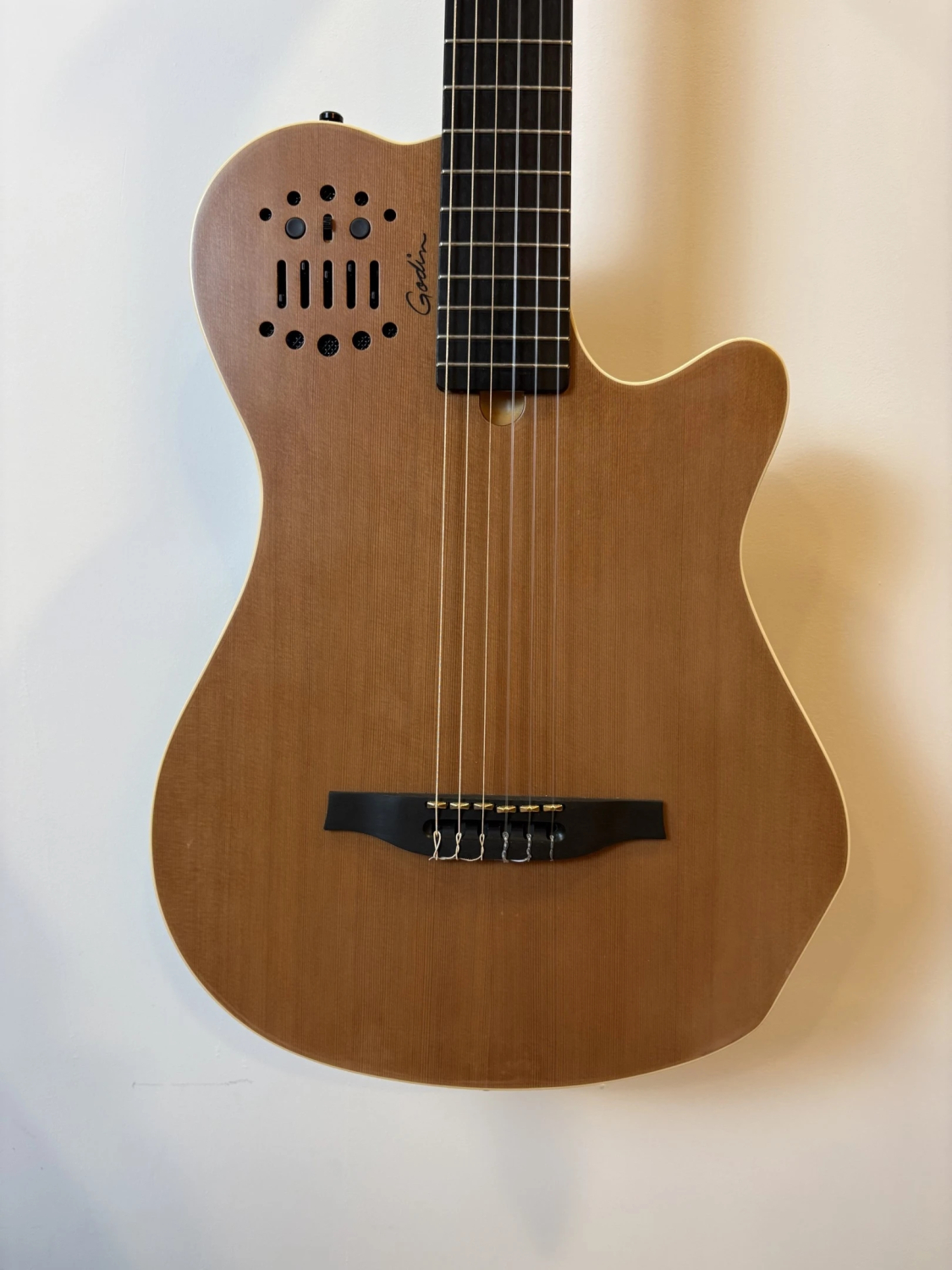 De Godin Multiac Grand Concert Natural is een high-end nylon-snarige elektro-akoestische gitaar die speciaal is ontworpen voor podiumgebruik. Dit model combineert de feel van een traditionele klassieke gitaar met moderne technologie en feedbackbestendigheid, waardoor hij ideaal is voor live optredens en studio-opnames.